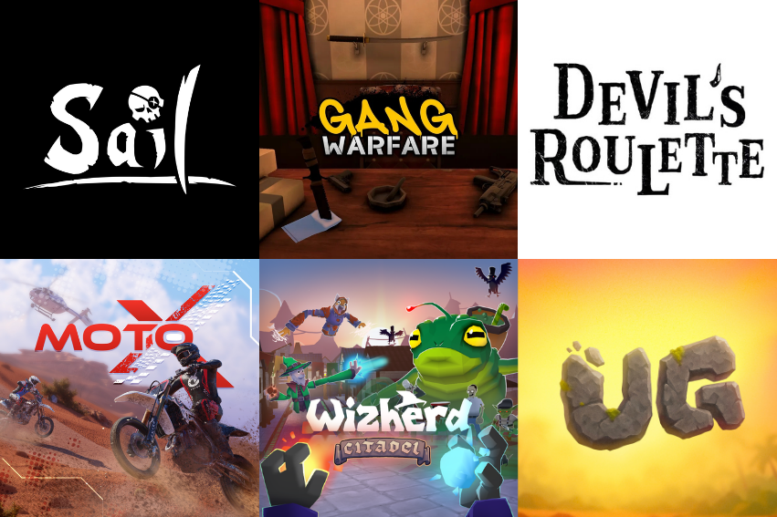 In-game prizes from UG, Devil's Roulette, MotoX, Gang Warfare, Sail, and Wizherd. Six of the top-50 most played games on Meta Quest, all free to play.